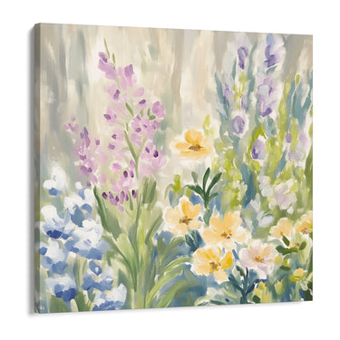 Maleriet forestiller en frodig forårshave, hvor blomsterne springer ud i en symfoni af farver. Pastelfarverne og de bløde penselstrøg skaber en rolig og afslappende atmosfære, perfekt til at tilføre et strejf af natur og ro til ethvert rum.