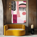 Dette lærredstryk med titlen "Armonia Rosata" er et moderne kunstværk, der fanger essensen af abstraktion og minimalisme. Maleriet forestiller et stiliseret ansigt, afgrænset af geometriske former og enkle linjer, hvilket skaber en fængslende og moderne visuel effekt.