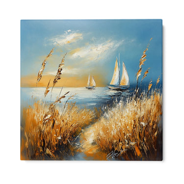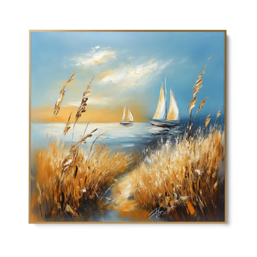 "Respiro Dorato" er et smukt lærredstryk, der fanger essensen af maritim ro. Dette billede skildrer en fredelig kystscene, hvor to sejlbåde glider blidt over et roligt hav, indrammet af høje stilke af gyldent korn, der bølger i vinden.