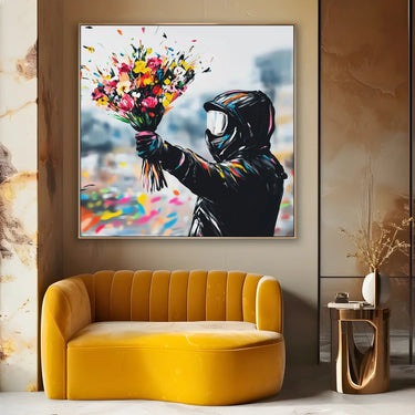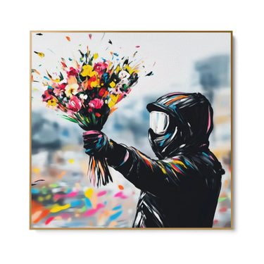 Dette lærredstryk repræsenterer et budskab om håb og fred midt i kaos. Figuren, som kunne opfattes som en demonstrant eller aktivist, tilbyder en buket blomster som et symbol på fred og kærlighed, i modstand mod vold og ødelæggelse. Det er en visuel påmindelse om ikkevoldens styrke og skønheden ved fredelig modstand.