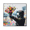 "Ribellione della Speranza" er et lærredstryk, der fanger essensen af fredelig modstand gennem et kraftfuldt og symbolsk billede. Maleriet forestiller en figur iført mørkt tøj og en beskyttende hjelm, som holder en livlig buket farverige blomster i hånden. Denne kontrast mellem det sorte tøj og de levende farver på blomsterne skaber en enestående visuel effekt.