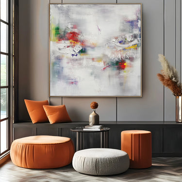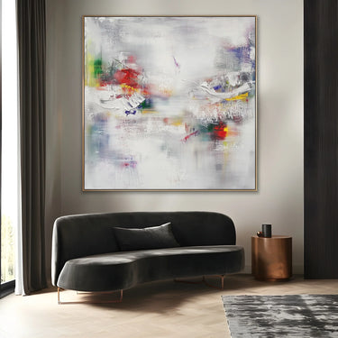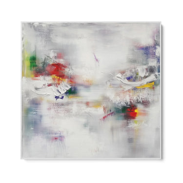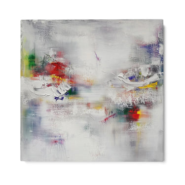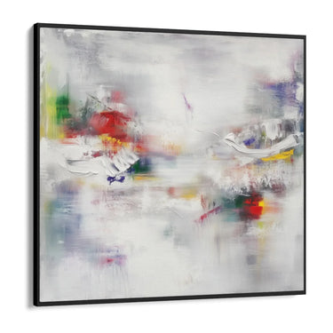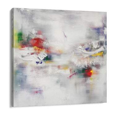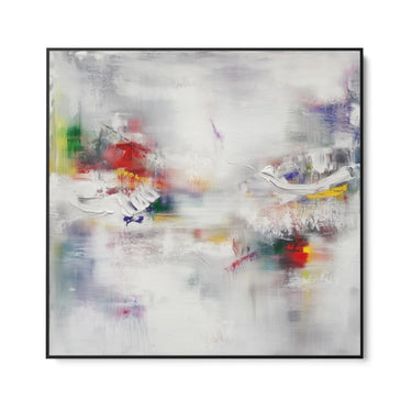 De dominerende farver inkluderer nuancer af hvid, grå, rød, gul og grøn. Disse farver er fordelt på en måde, der skaber en afbalanceret og behagelig kontrast for øjet. Accenter af blå og lilla tilføjer dybde og kompleksitet til værket.