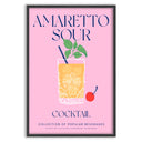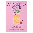 Denne Plakat forestiller en Amaretto Sour cocktail, en klassisk drink kendt for sin søde og let syrlige smag. Det centrale billede viser et glas dekoreret med et elegant mønster, fyldt med en gul-orange drik. Over glasset er der friske grønne blade, som tilføjer liv til illustrationen. Ved siden af glasset er der et rødt kirsebær, et ikonisk symbol for mange cocktails.