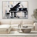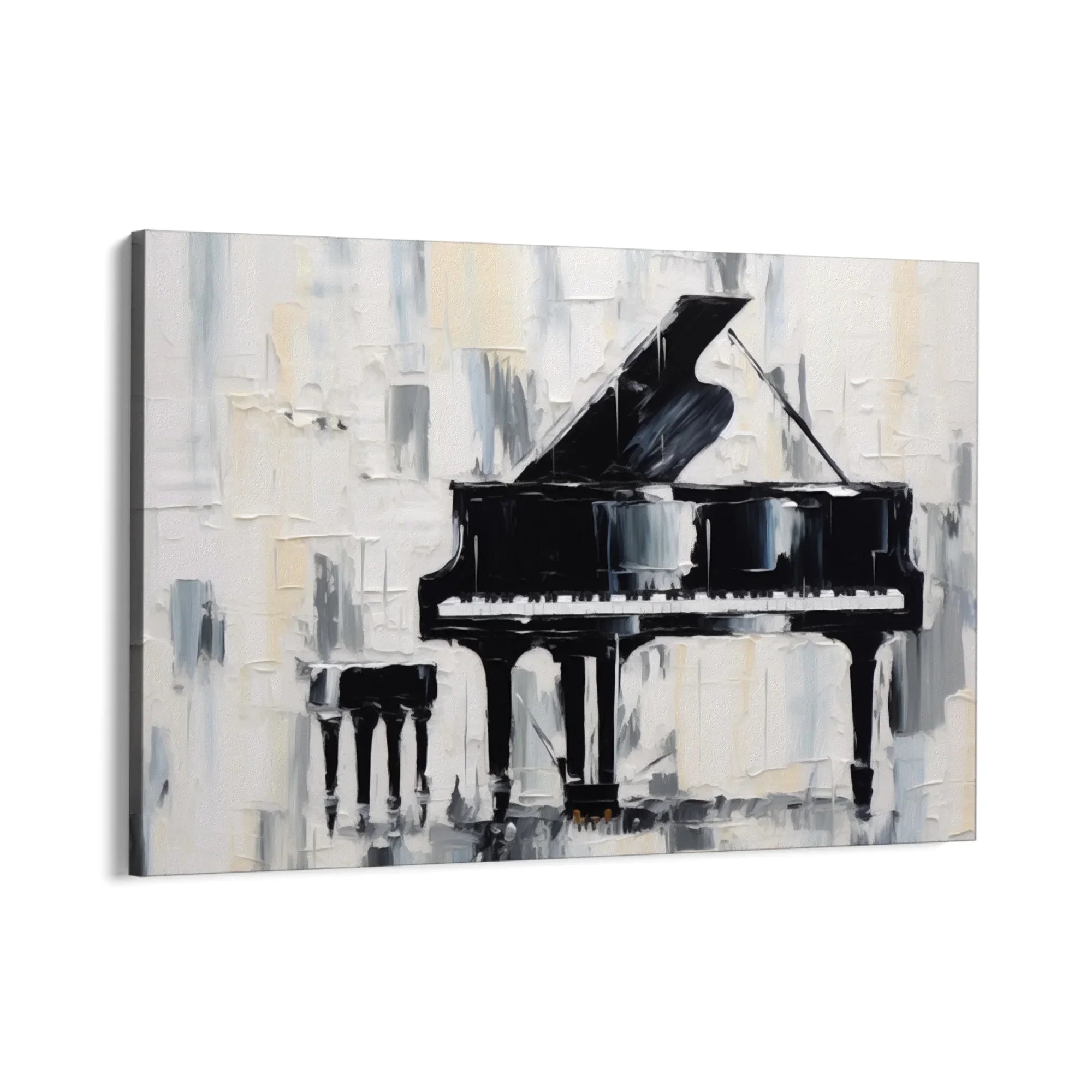 De fremherskende farver i dette værk er sort og hvid, med grå nuancer og strejf af beige. Kontrasten mellem klaverets sorte og lyse baggrund skaber en fængslende visuel effekt, der understreger musikinstrumentets majestæt.
