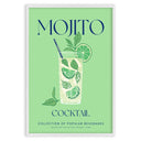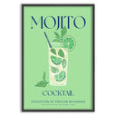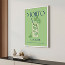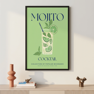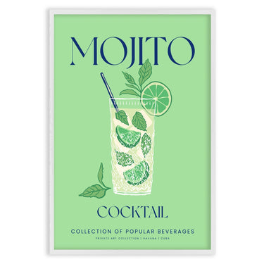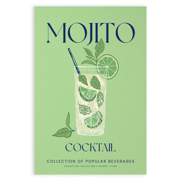 Denne plakat forestiller en lækker Mojito-cocktail, en klassiker inden for cubansk mixologi. Designet er elegant og minimalistisk, med et højt og gennemsigtigt glas fyldt med limebåde, mynteblade og knust is. Et strejf af friskhed tilføjes af et mørkeblåt sugerør.