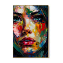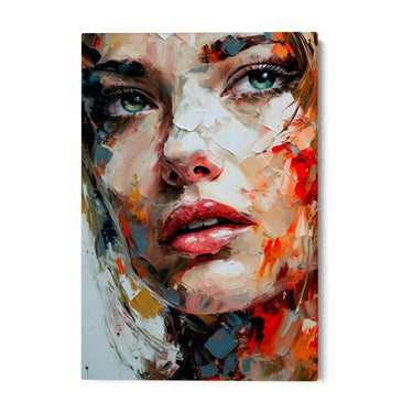 Hvert portrætansigt udtrykker en række intense følelser gennem gennemtrængende øjne og veldefinerede læber. Det første maleri til venstre bruger køligere, neutrale toner, mens det andet i midten eksploderer i et væld af varme og kolde farver, hvilket skaber en fascinerende kontrast. Det tredje maleri til højre vender tilbage til mere sarte, men ikke mindre udtryksfulde toner.