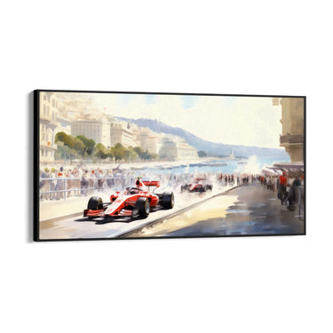 Das Gemälde „Red Speed“ ist ein Druck auf Leinwand, der die Emotionen und das Adrenalin eines Autorennens einfängt. Im Vordergrund flitzen zwei rote Rennwagen über die Rennstrecke, das Publikum schaut gespannt von den Tribünen aus zu. Die Szene spielt in einer Küstenstadt mit eleganten Gebäuden und Hügeln im Hintergrund.