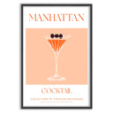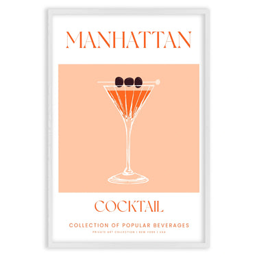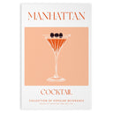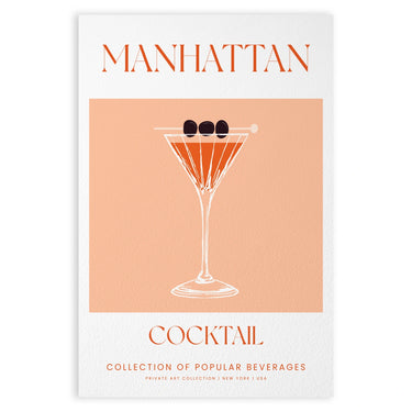 Oben auf dem Poster steht in eleganten Buchstaben "Manhattan", während unten das Wort "Cocktail" zusammen mit der Aufschrift "Collection of Popular Beverages" zu finden ist. Dieses Poster ist Teil einer privaten Kunstsammlung in New York, USA.