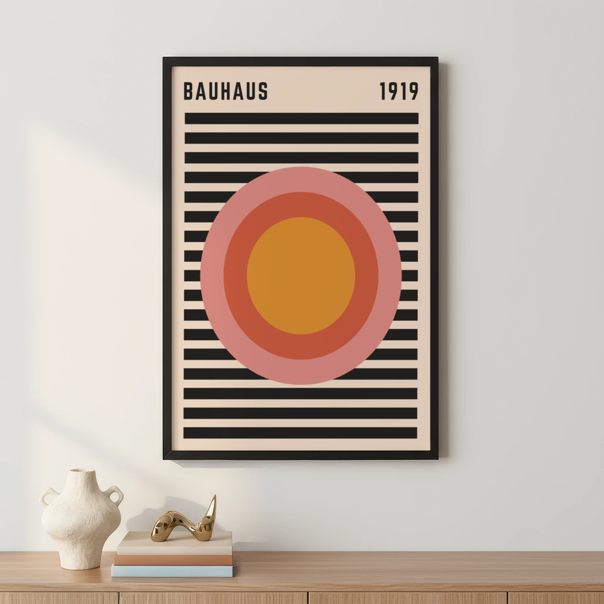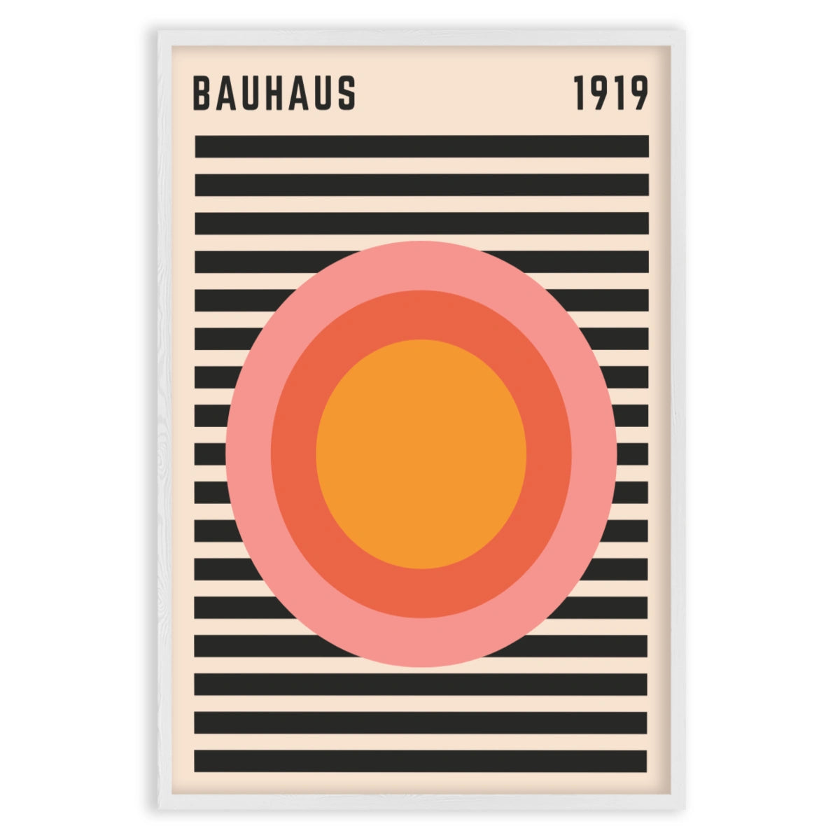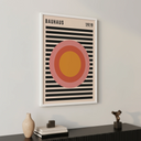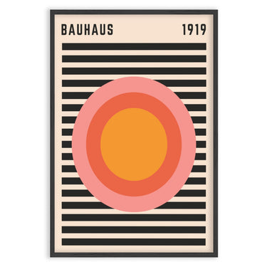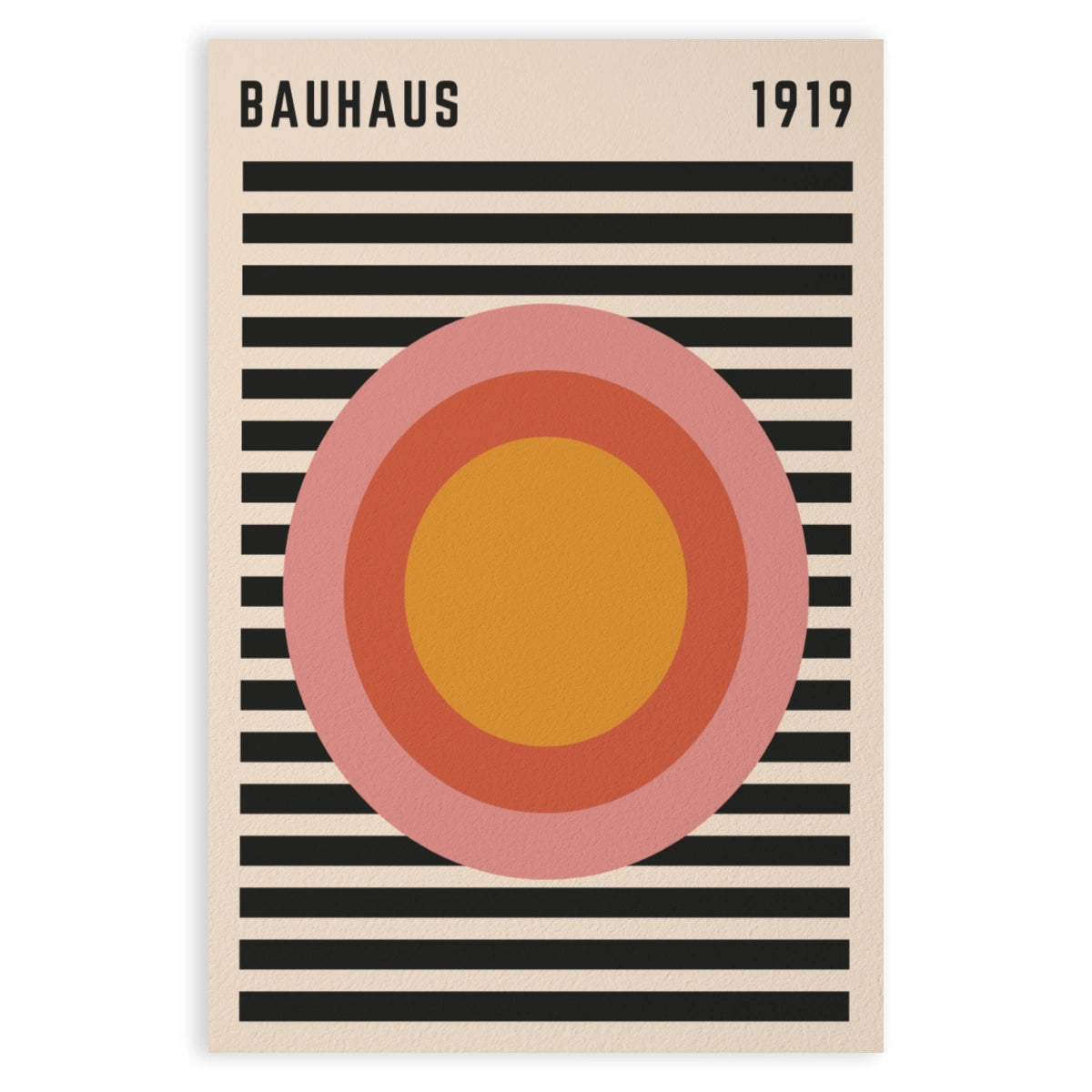 Το πόστερ "Ritmo Radiale" είναι ένας φόρος τιμής στην αισθητική Bauhaus, με το έτος 1919 να αναγράφεται καθαρά, σηματοδοτώντας την αρχή αυτού του επαναστατικού καλλιτεχνικού κινήματος. Στο κέντρο του σχεδίου βρίσκεται μια σειρά συγκεντρικών κύκλων σε ζεστές αποχρώσεις πορτοκαλί και ροζ, που δημιουργούν ένα υπνωτιστικό και δυναμικό οπτικό εφέ.