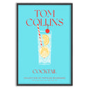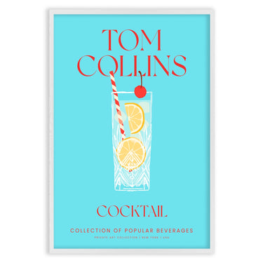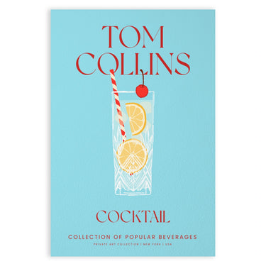 Ο τίτλος "Tom Collins" είναι γραμμένος με μεγάλα κόκκινα γράμματα, αμέσως ορατός στο πάνω μέρος της Αφίσας. Κάτω από το ποτήρι, η λέξη "Cocktail" είναι επίσης κόκκινη, ακολουθούμενη από τη φράση "Collection of Popular Beverages" με μικρότερα γράμματα.
