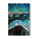 "The Starry Night" is a fascinating artwork by Edvard Munch, capturing the mysterious beauty of a starry night. This canvas print depicts a nighttime landscape, where the sky is dominated by intense shades of blue and green, dotted with bright stars that seem to almost dance in the firmament.