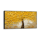 The composition of the painting highlights a tree with a robust and dark trunk, which stands majestically in the center of the canvas. The branches expand into a lush canopy of golden leaves, a symbol of abundance and prosperity. The neutral background, with beige and white tones, allows the golden leaves to stand out even more, creating a fascinating contrast.