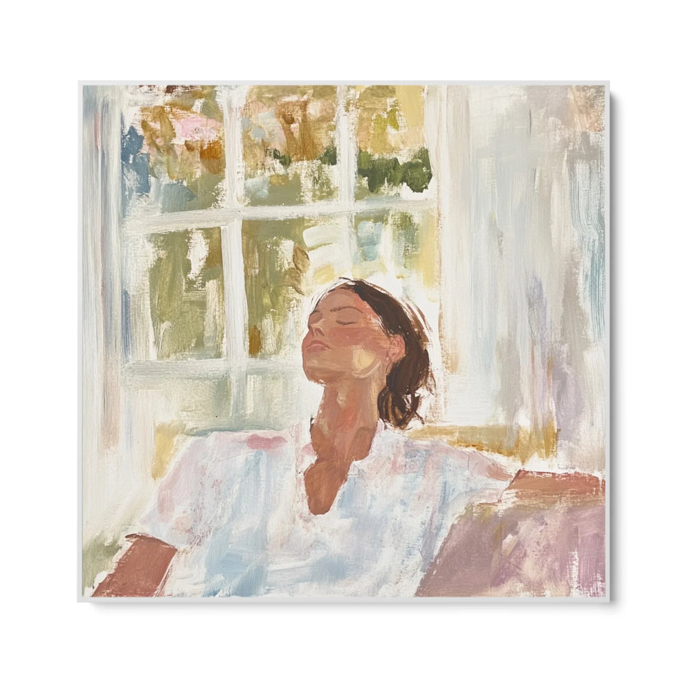 The painting "Radiant Morning" captures a moment of serene contemplation. The scene depicts a woman sitting near a window, her face turned towards the morning light. Her eyes are closed, conveying a sense of peace and tranquility.