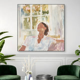 The painting technique is soft and blurred, giving the picture an ethereal and dreamy appearance. The light coming through the window gently illuminates the woman's face, emphasizing the details of her face and hair. This canvas painting is perfect for adding a touch of elegance and serenity to any environment.