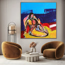 "Incanto Solare" is a canvas print that captures the essence of abstract art with an explosion of vibrant and dynamic colors. The central figure, outlined with bold black strokes, appears to represent a human figure in a relaxed pose, immersed in an abstract and vibrant context.