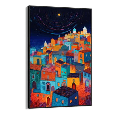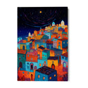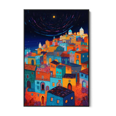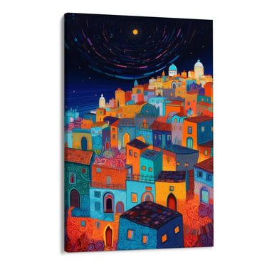 The colors used in the painting are lively and intense, creating a magical and evocative atmosphere. The predominant shades are the deep blue of the night sky, the golden yellow of the house lights, and various shades of orange, red and green that bring the homes and architectural details to life.