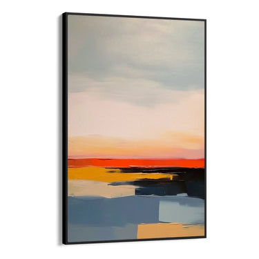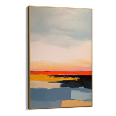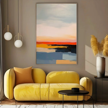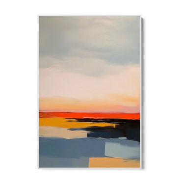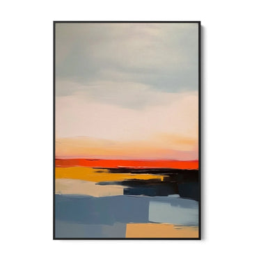 The painting represents a minimalist landscape with a horizon that seems to merge with the sky. Warm and cold shades meet, creating a harmonious balance between sky and earth.
