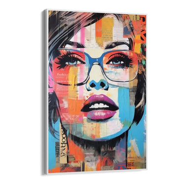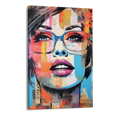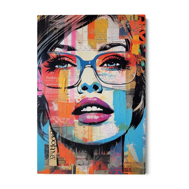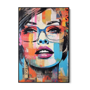 The "Woman Graffiti" canvas print represents a vibrant and modern portrait of a woman with glasses. The work is characterized by a bold use of bright colors such as orange, blue, pink, yellow and black, which blend together in a unique and dynamic style.