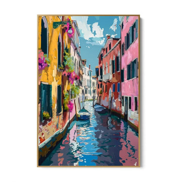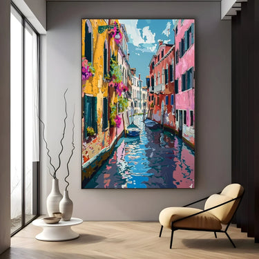 The painting "Venetian Impressions" captures the magic and charm of a typical Venetian canal. The facades of the houses, painted in bright shades of yellow, pink and red, are reflected in the calm waters of the canal, creating a play of lights and colors that enchants the observer. Balconies adorned with colorful flowers add a touch of liveliness and freshness to the scene.