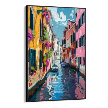 The colors used in this canvas print are particularly vibrant and contrasting. The warm yellow of the houses mixes harmoniously with the bright pink and intense red, while the blue of the water and the sky adds depth and tranquility to the composition. The floral details in pink and purple give an additional touch of elegance and beauty.