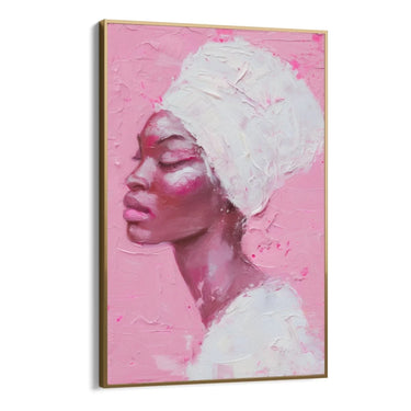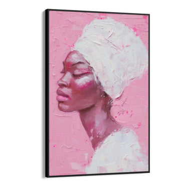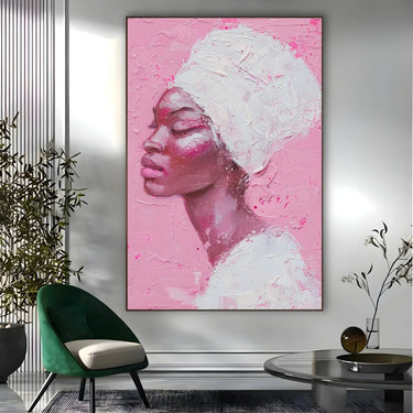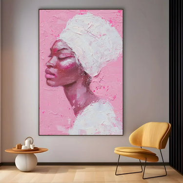 The predominant colors are pink and white. The pink background creates a delicate contrast with the darker shades of the woman's skin, while the white used for the headdress and clothing adds a touch of purity and simplicity to the work.