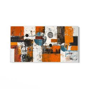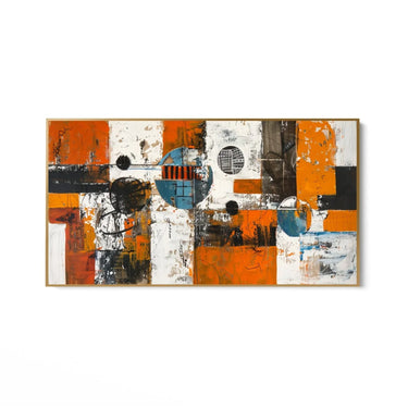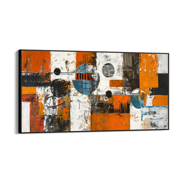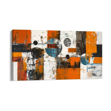 The predominant colors in this painting are bright orange, white, black and blue. Orange, in particular, adds a lively and energetic touch, while black and white offer a stark contrast that accentuates the geometric shapes. Blue, used in some of the circular shapes, adds depth and balance to the composition.