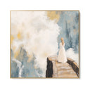 This canvas print, titled "Amber Smoke," depicts a suggestive and dreamlike scene. At the center of the work, a female figure in a white dress stands on a rocky promontory, facing a landscape shrouded in thick fog. The woman seems to be contemplating the horizon, immersed in her thoughts.
