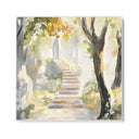 The painting "Golden Entrance" is a canvas print that captures a charming scene of a path winding through a luminous forest. At the center of the composition, a staircase immersed in nature leads the viewer towards a mysterious entrance, evoking a sense of adventure and discovery.