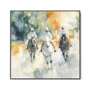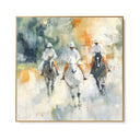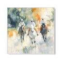 "Golden Walk" is a canvas print that captures a moment of grace and energy. Three riders advance confidently, creating a sense of fluid and harmonious movement. The artist uses bold brushstrokes and delicate shades to bring this dynamic scene to life.