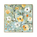 The predominant colors are the yellow and white of the flowers, which contrast beautifully with the aqua green background. Small touches of orange and red add liveliness and depth, making the painting a true visual masterpiece.