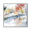 The trees, with their brightly colored leaves, seem to dance to the rhythm of the autumn wind, while the stream faithfully reflects the surrounding environment, adding a touch of realism and tranquility. This artwork is perfect for those who wish to bring a piece of nature and serenity into their home.