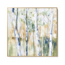 "Voices Among the Trunks" is a beautiful canvas print that captures the serene and mysterious essence of a birch forest. The tree trunks, painted with delicate shades of white and blue, stand out against a background of green and brown tones, evoking a sense of tranquility and connection with nature.