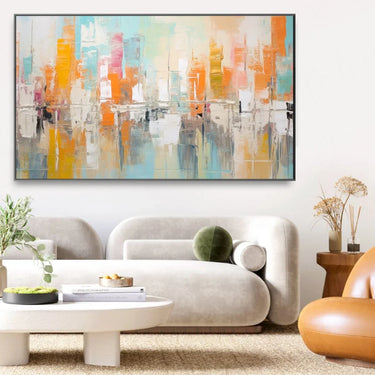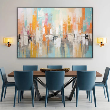 "Attimo Delicato" is a canvas print that captures the essence of an abstract urban landscape. The bold brushstrokes and bright colors create a dynamic and modern atmosphere.