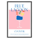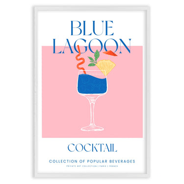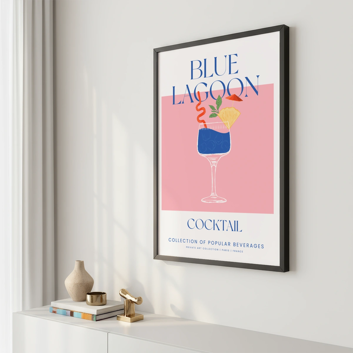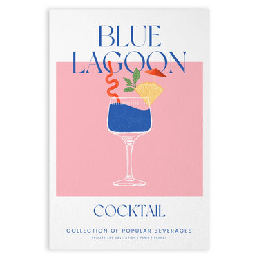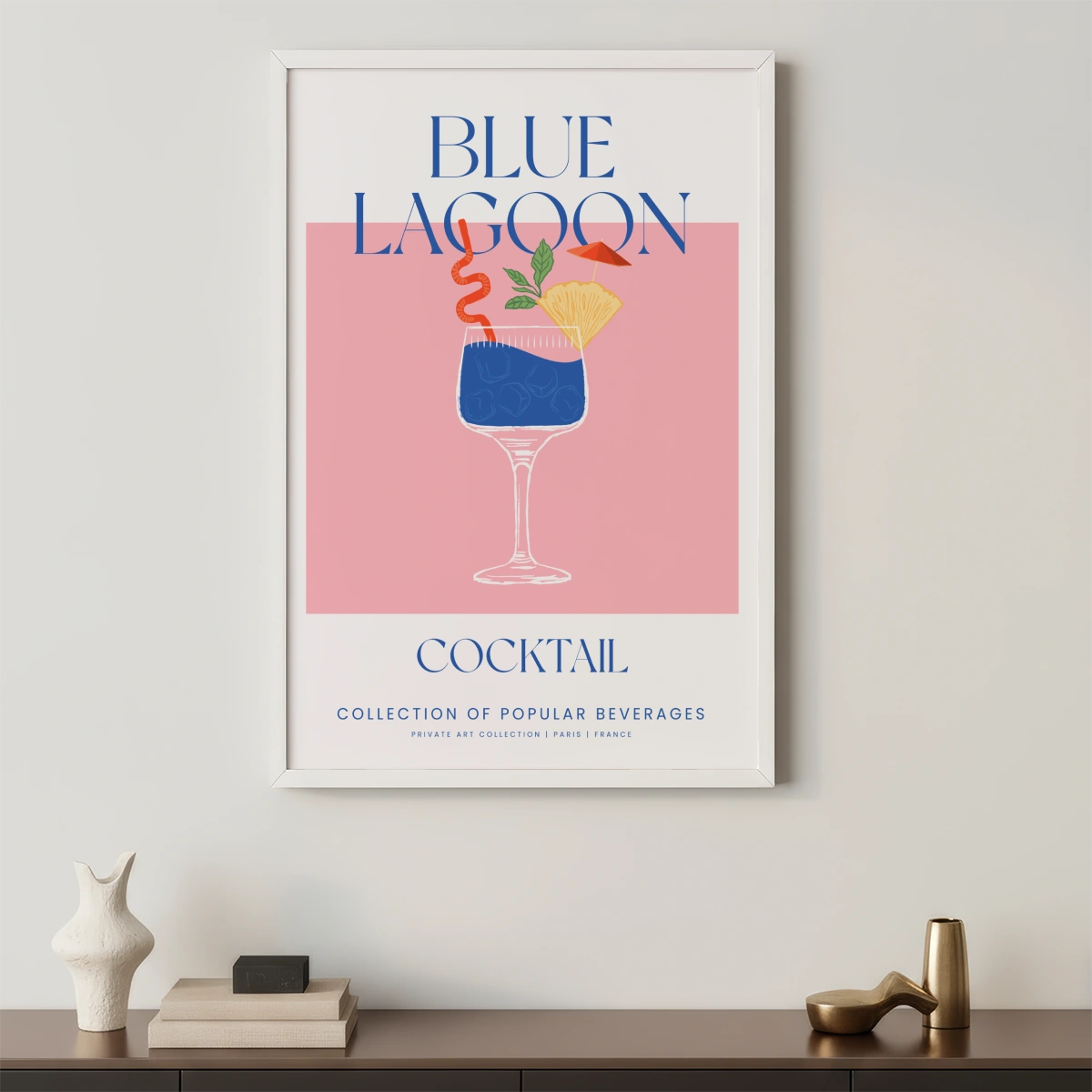The poster depicts an elegant Blue Lagoon cocktail, highlighted by bright and fresh colors. At the center of the poster is a cocktail glass filled with a bright blue drink, decorated with ice, a slice of pineapple, a green leaf, and a red umbrella.