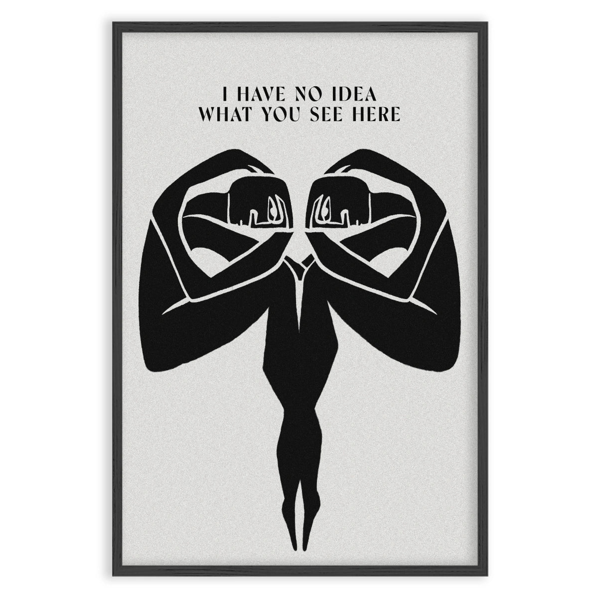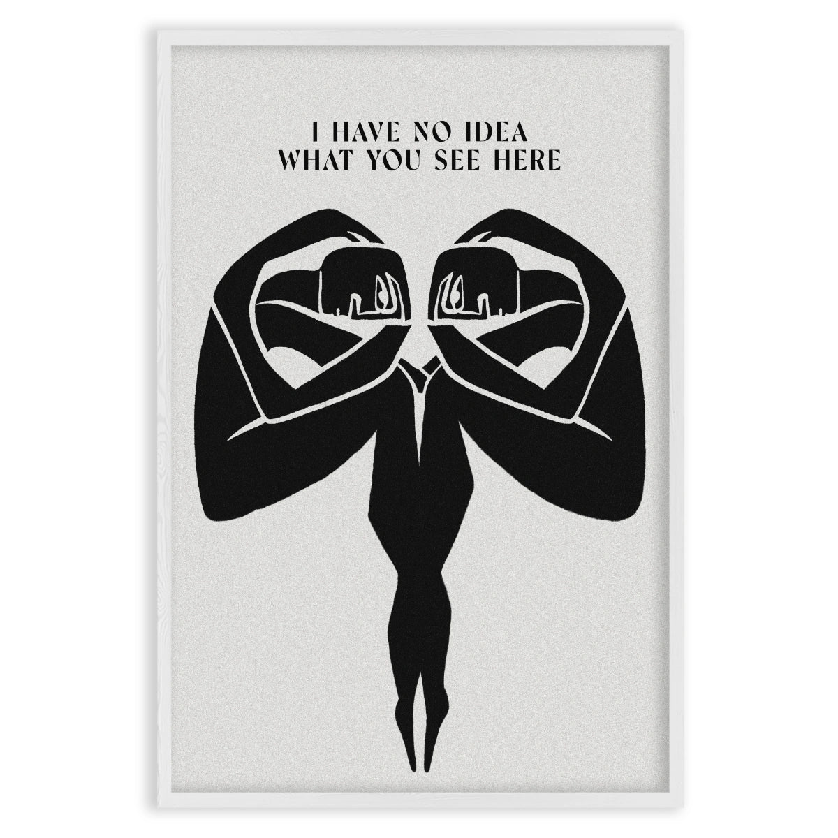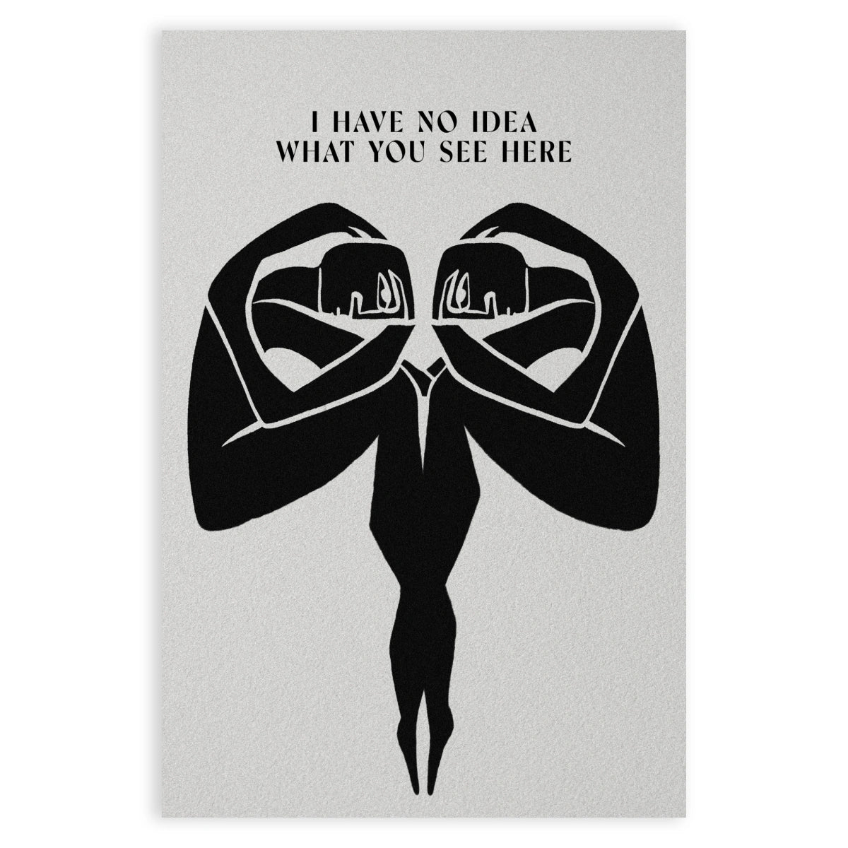 The composition can be interpreted in various ways, stimulating the imagination and reflection of the observer. The inscription at the top, "I HAVE NO IDEA WHAT YOU SEE HERE", suggests that the meaning of the drawing is open to the personal interpretation of the viewer.