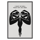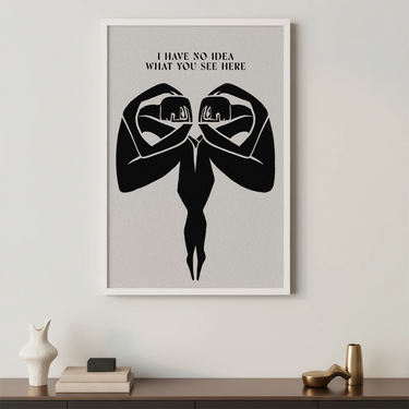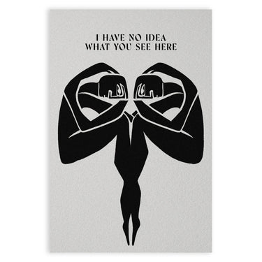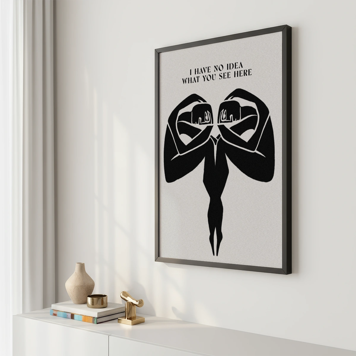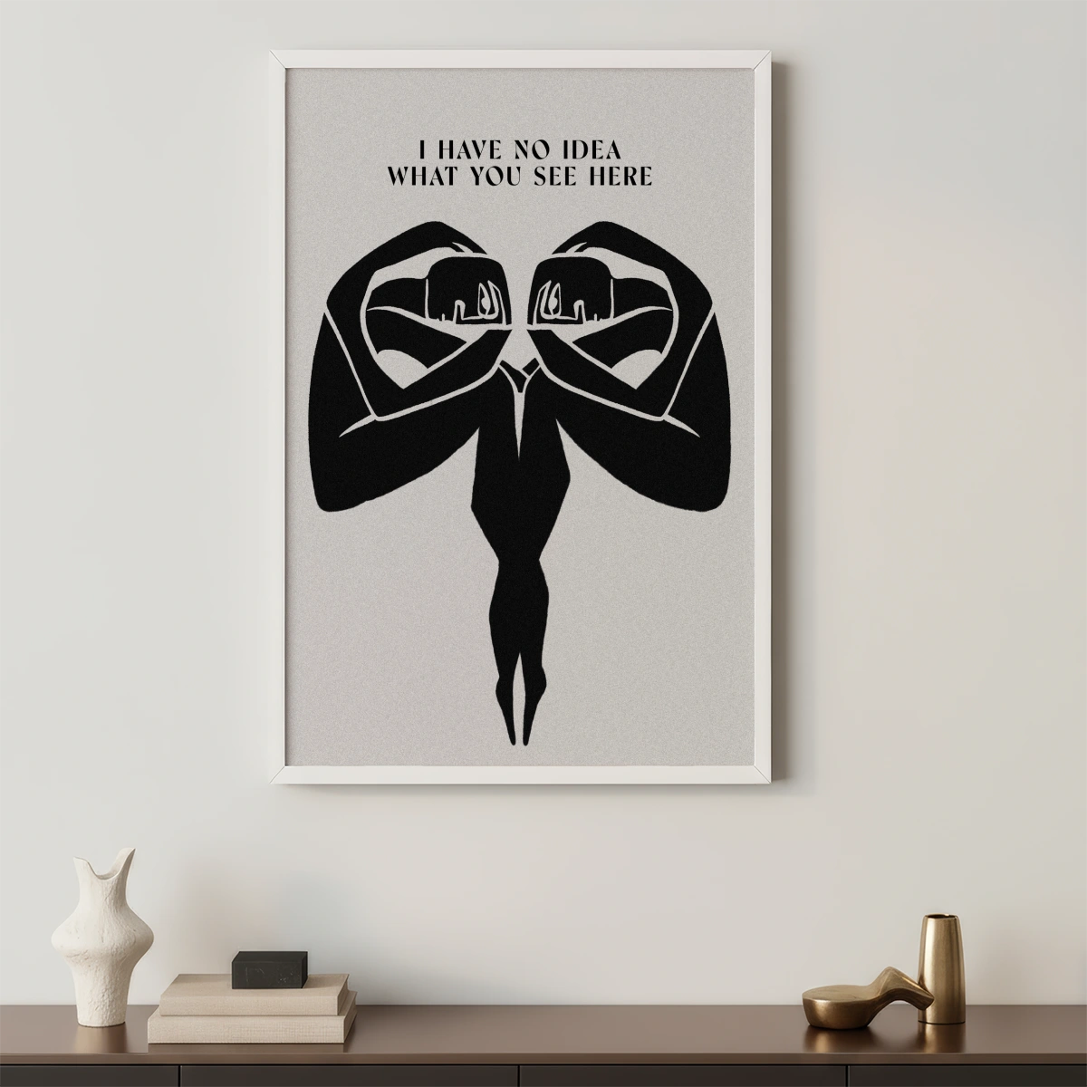 The composition can be interpreted in various ways, stimulating the imagination and reflection of the observer. The inscription at the top, "I HAVE NO IDEA WHAT YOU SEE HERE", suggests that the meaning of the drawing is open to the personal interpretation of the viewer.