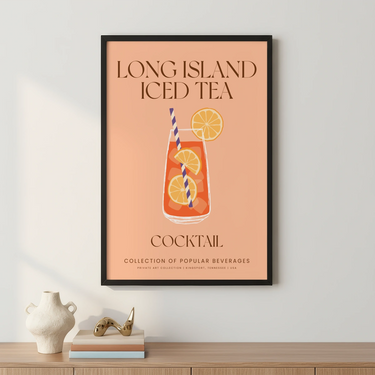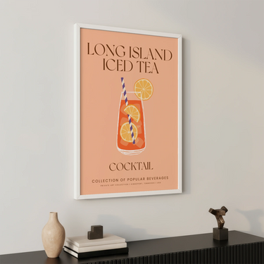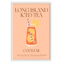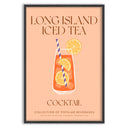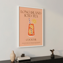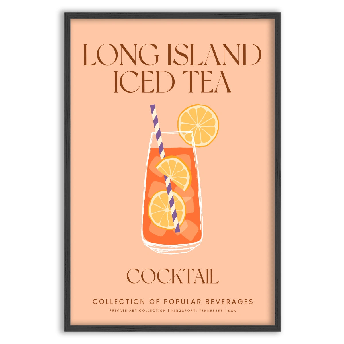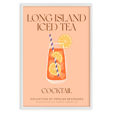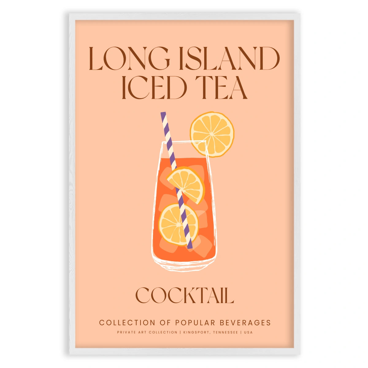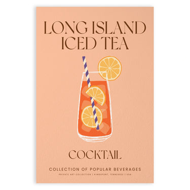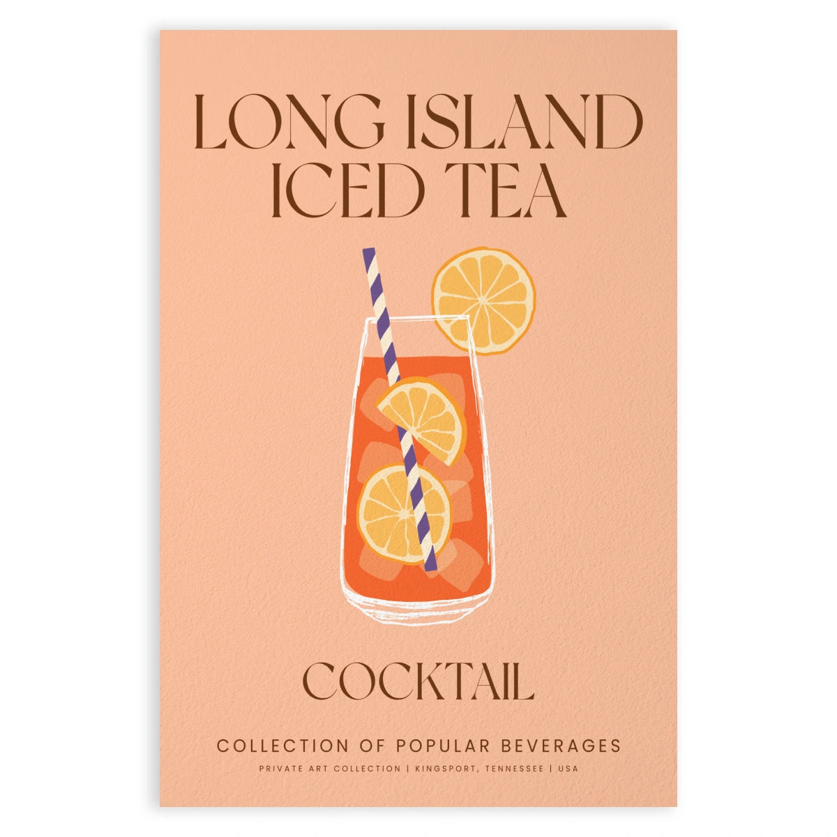 This Poster depicts a glass of Long Island Iced Tea, an iconic cocktail. The glass is filled with a bright orange drink and decorated with lemon slices. A purple and white striped straw adds a touch of elegance to the design.