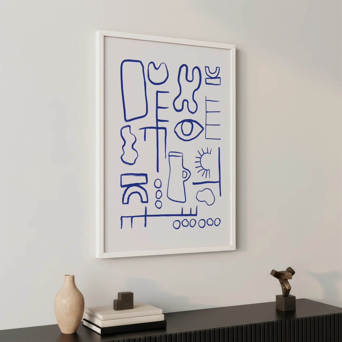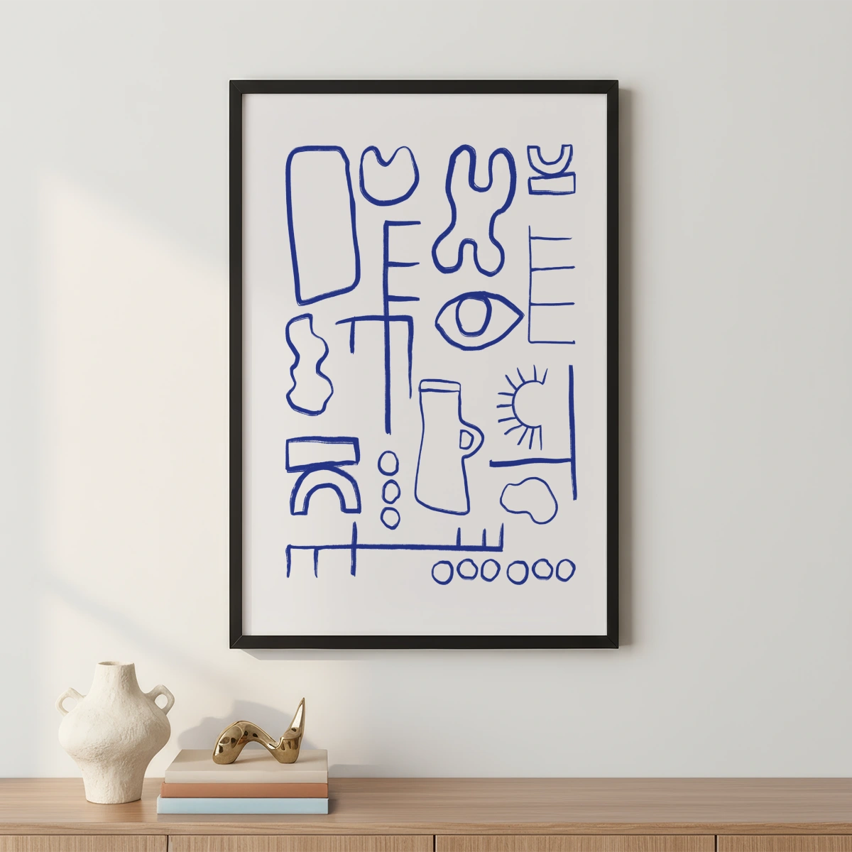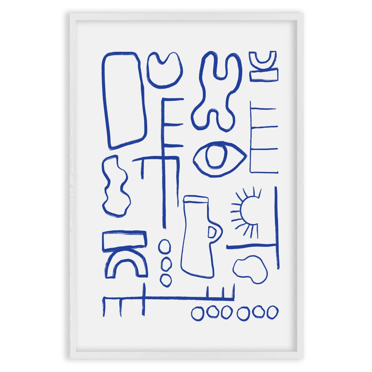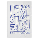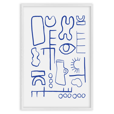 The predominant color is blue, used to trace all the shapes and lines on the white background. This color combination gives the Poster a clean and modern look, perfect for any contemporary setting.