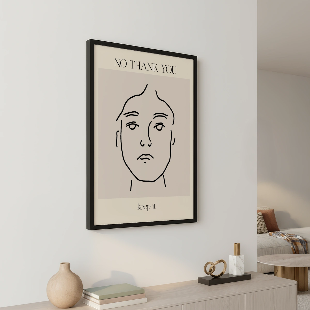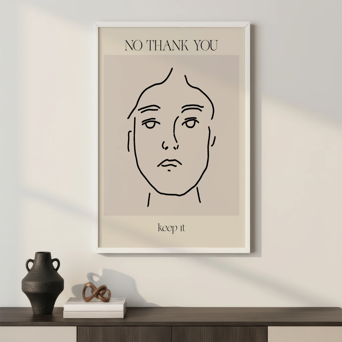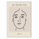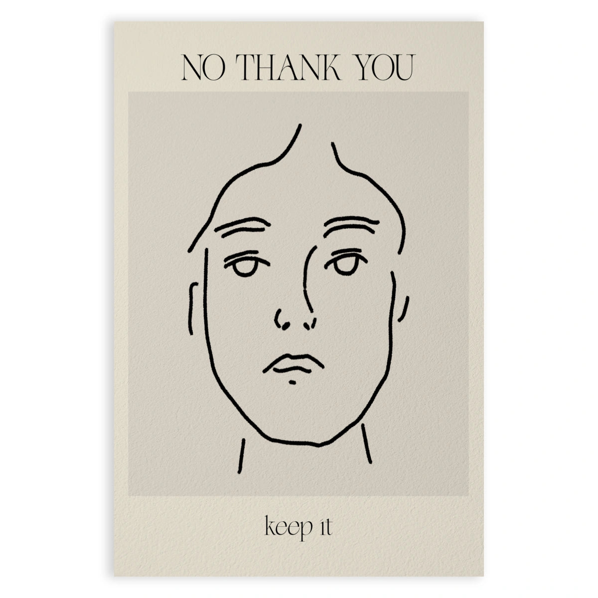 The Poster "No Thank You" features a minimalist and modern design. In the center of the Poster, on a light beige background, is a stylized figure of a human face drawn with simple but expressive black lines.