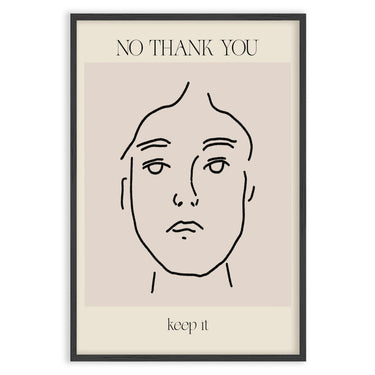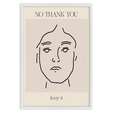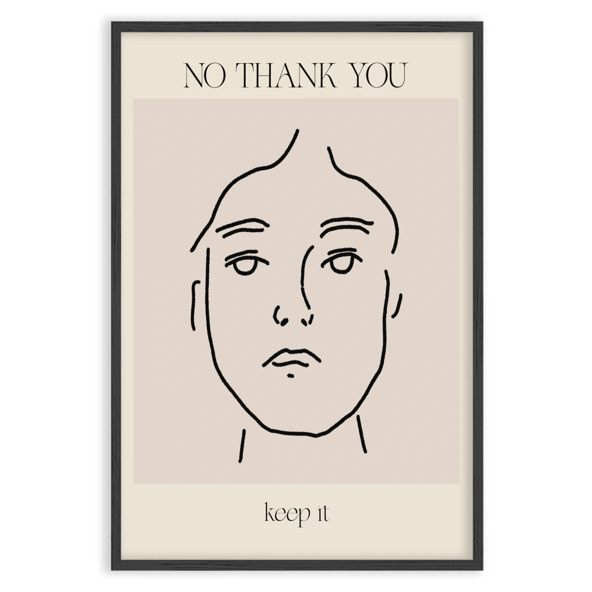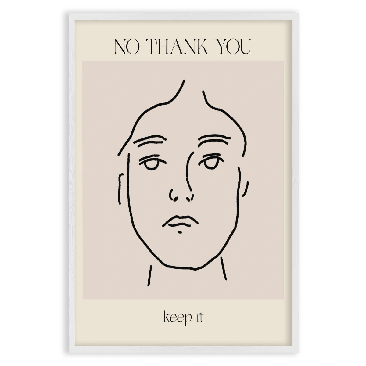 The Poster "No Thank You" features a minimalist and modern design. In the center of the Poster, on a light beige background, is a stylized figure of a human face drawn with simple but expressive black lines.