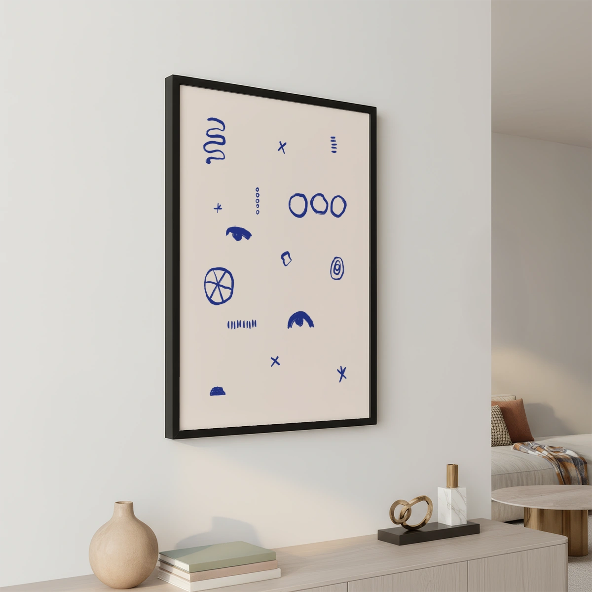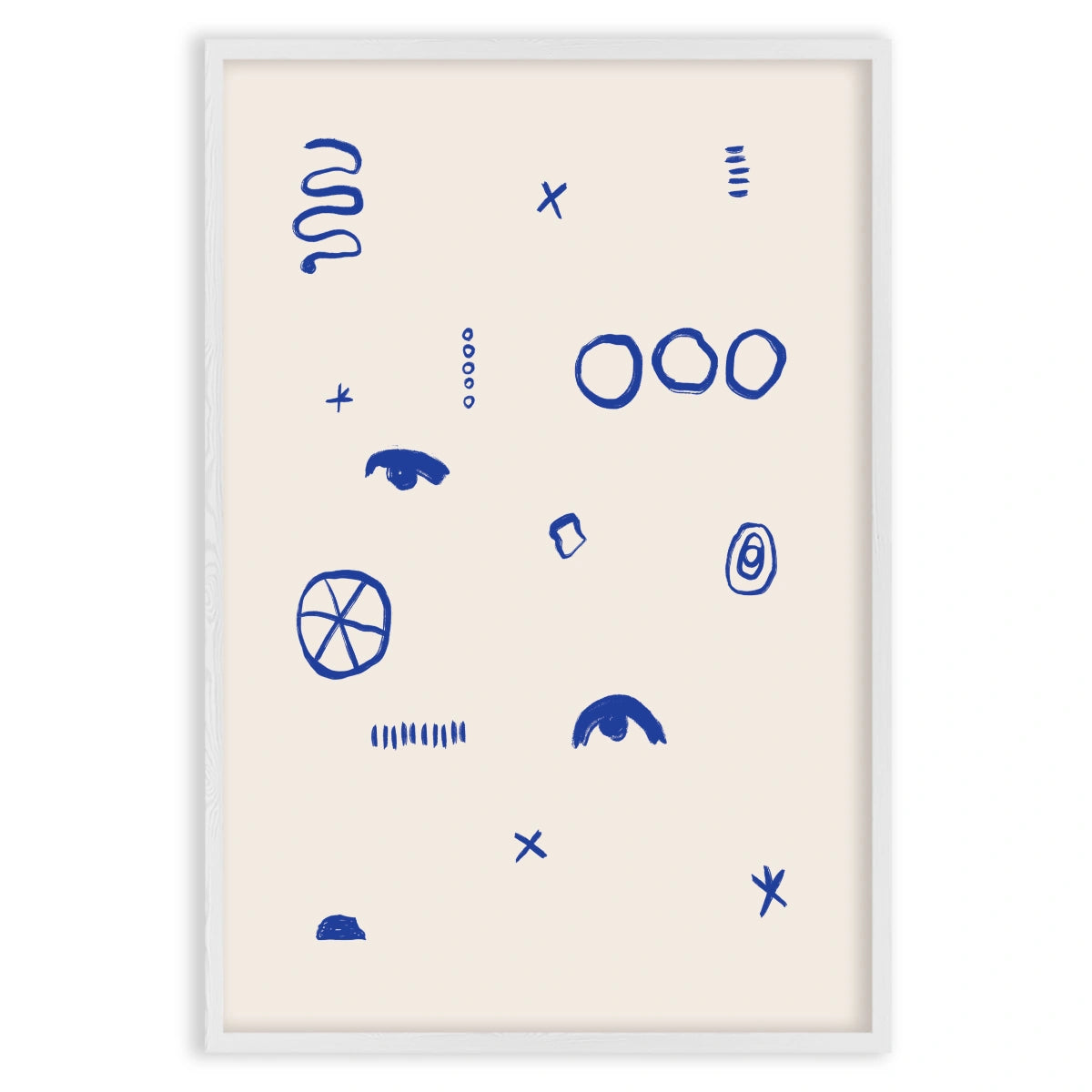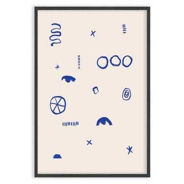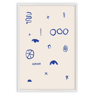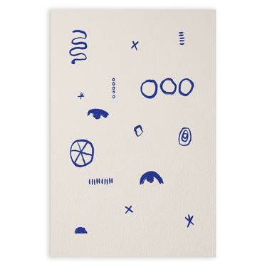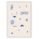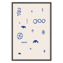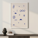 The "Simboli Quieti" poster is a minimalist artwork that captures attention with its simplicity and use of abstract symbols. On a white background, various graphic signs in deep blue are distributed, creating a fascinating visual contrast.