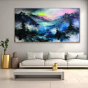 Los colores predominantes son el azul y el verde, que evocan sensación de tranquilidad y frescura. Los tonos negros y grises de las montañas crean un fuerte contraste con el cielo, que se desvanece del rosa al amarillo, sugiriendo un amanecer o un atardecer impresionantes. Las pinceladas dinámicas y el juego de luces y sombras dan a la pintura una atmósfera vívida y atractiva.