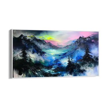 "Echo del valle" es un lienzo que captura la majestuosidad de un paisaje de montaña. La escena representa un valle rodeado de imponentes montañas, con picos nevados recortados contra el cielo. Los árboles oscuros en primer plano añaden profundidad y contraste a la vista.