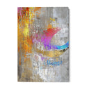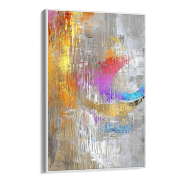 "Frattura Dorata" es una impresión en lienzo que capta la atención con su vibrante explosión de colores y texturas. Esta pieza de arte abstracto presenta una combinación de tonos dorados, plateados, naranjas, violetas y azules, creando un efecto visual dinámico y envolvente.