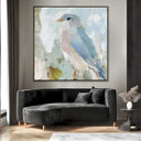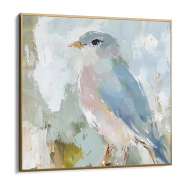 El cuadro representa un pájaro posado, con una expresión calma y contemplativa. El uso de colores suaves y matices delicados crea una atmósfera de tranquilidad y paz, haciendo que esta obra de arte sea ideal para ambientes que necesitan un toque de serenidad.