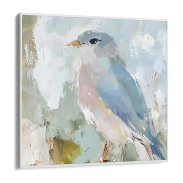 "Occhi Celesti" es una hermosa impresión en lienzo que captura la esencia delicada y serena de un pájaro de colores pastel. La representación se caracteriza por pinceladas suaves y difuminadas que le dan al sujeto un aspecto etéreo y soñador.