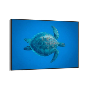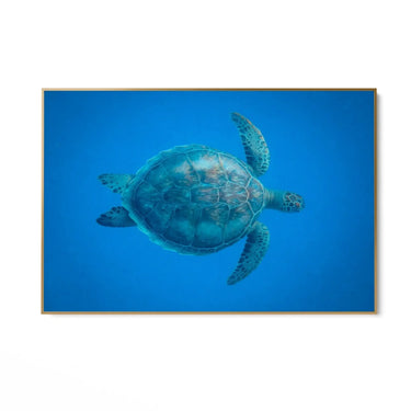 Valdavaks värvitooniks on erinevad sinise varjundid, mis loovad lõõgastava ja kaasahaarava atmosfääri. Kilpkonna kest on kujutatud rohelise ja pruuni toonides, lisades pildile sügavust ja realismi. Värvide oskuslik kasutamine muudab selle kunstiteose täiuslikuks lisandiks igasse keskkonda, mis soovib edastada rahu ja loomulikku ilu.