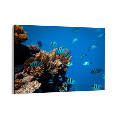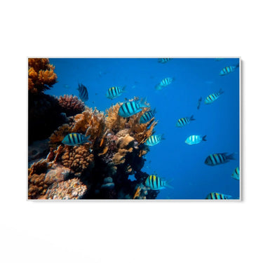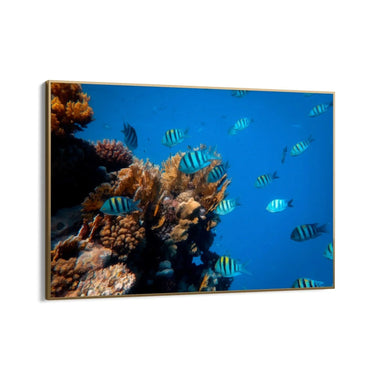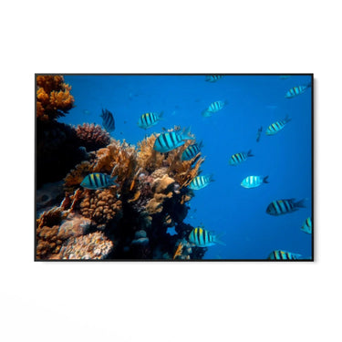 Selle maali valdavaks värviks on sügavsinine vesi, mis loob põneva kontrasti korallide oranžide ja pruunide toonidega. Kalad lisavad elavaid värvilaike oma siniste ja mustade triipudega, luues dünaamilise ja harmoonilise visuaalse efekti.