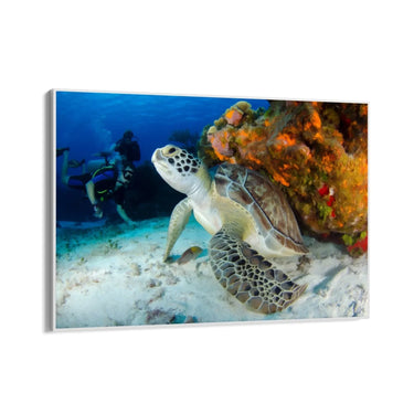 Selle maali domineerivad värvid on ookeani sügav sinine, mis loob kontrastse tausta korallide soojade ja elavate toonidega. Korallide oranžid, punased ja kollased varjundid lisavad kompositsioonile elavust, samal ajal kui kilpkonna ja liiva loomulikud toonid täiendavad stseeni harmooniliselt.