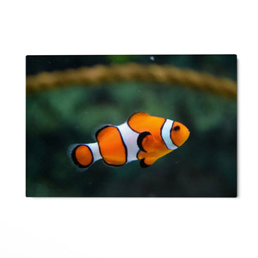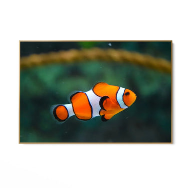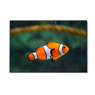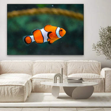 Selle trükise valdavaks värviks on oranž, valge ja must, mis kuuluvad klounkala juurde ning mis kontrastuvad suurepäraselt rohelise-sinaka taustaga. See värvikombinatsioon loob köitva ja rahustava visuaalse efekti, mis sobib ideaalselt looduse ja elavuse lisamiseks sinu ruumi.